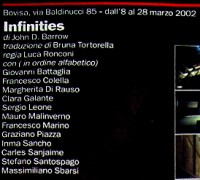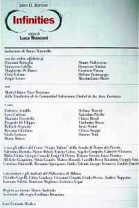 …Spettacolo che è un’esplorazione nelle regioni del nulla, anche se l’infinito non è il nulla: un viaggio che parte dall’albergo infinito… finchè si approda nel passato per conoscere Pitagora e spiegargli il suo teorema… col fascino e le suggestioni degli spazi in cui Ronconi ha ordinato le cinque scene alle quali danno voce e mistero “infiniti” attori: ricordiamo… Margherita Di Rauso…